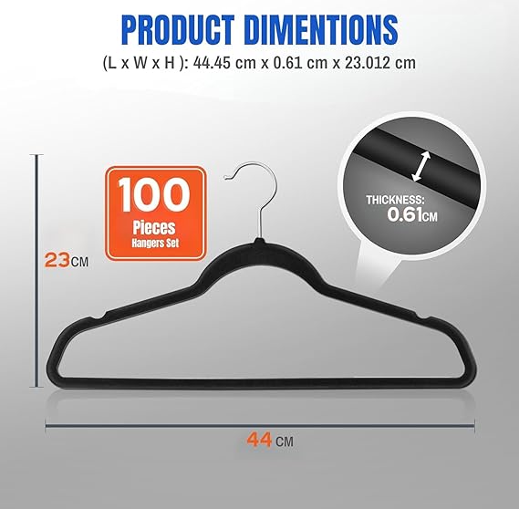 • 100 PACK: Comes in a pack of 100 attractive black velvet flocked hangers, measuring 44.45cm x 0.6cm x 23.01cm, perfect for adult-size clothing. Each hanger is rounded and features convenient hooks for hanging suit ties and small accessories.