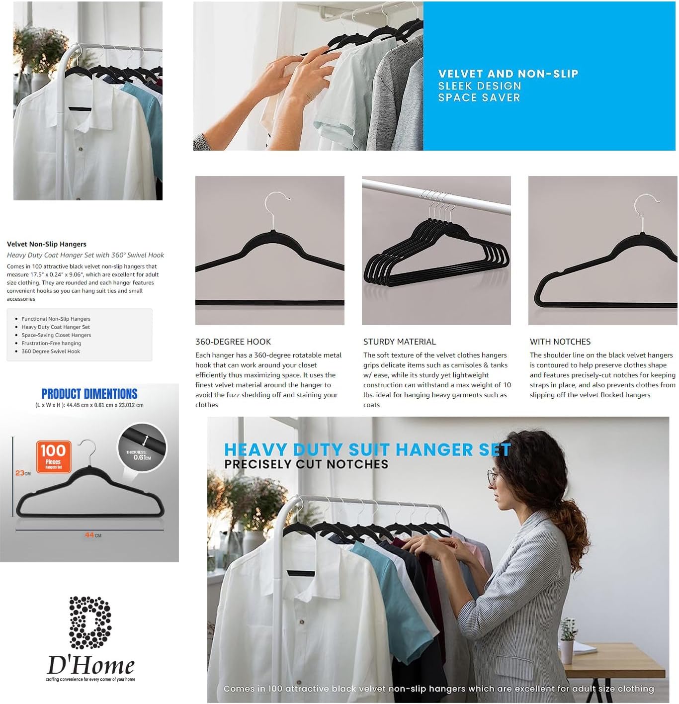 D’Home 100-Pack Black Velvet Non-Slip Coat Hangers with 360° Swivel Hook